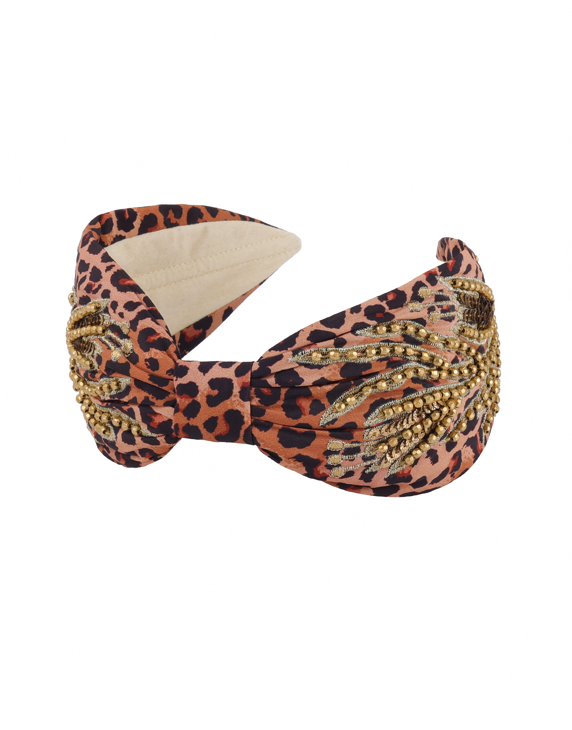 The Leopard Espresso Headband is adorned with golden beads and sequins arranged in curved lines and clusters, creating a textured, dimensional effect. The contrast between the expresso brown fabric and the gold embellishments makes the design stand out.