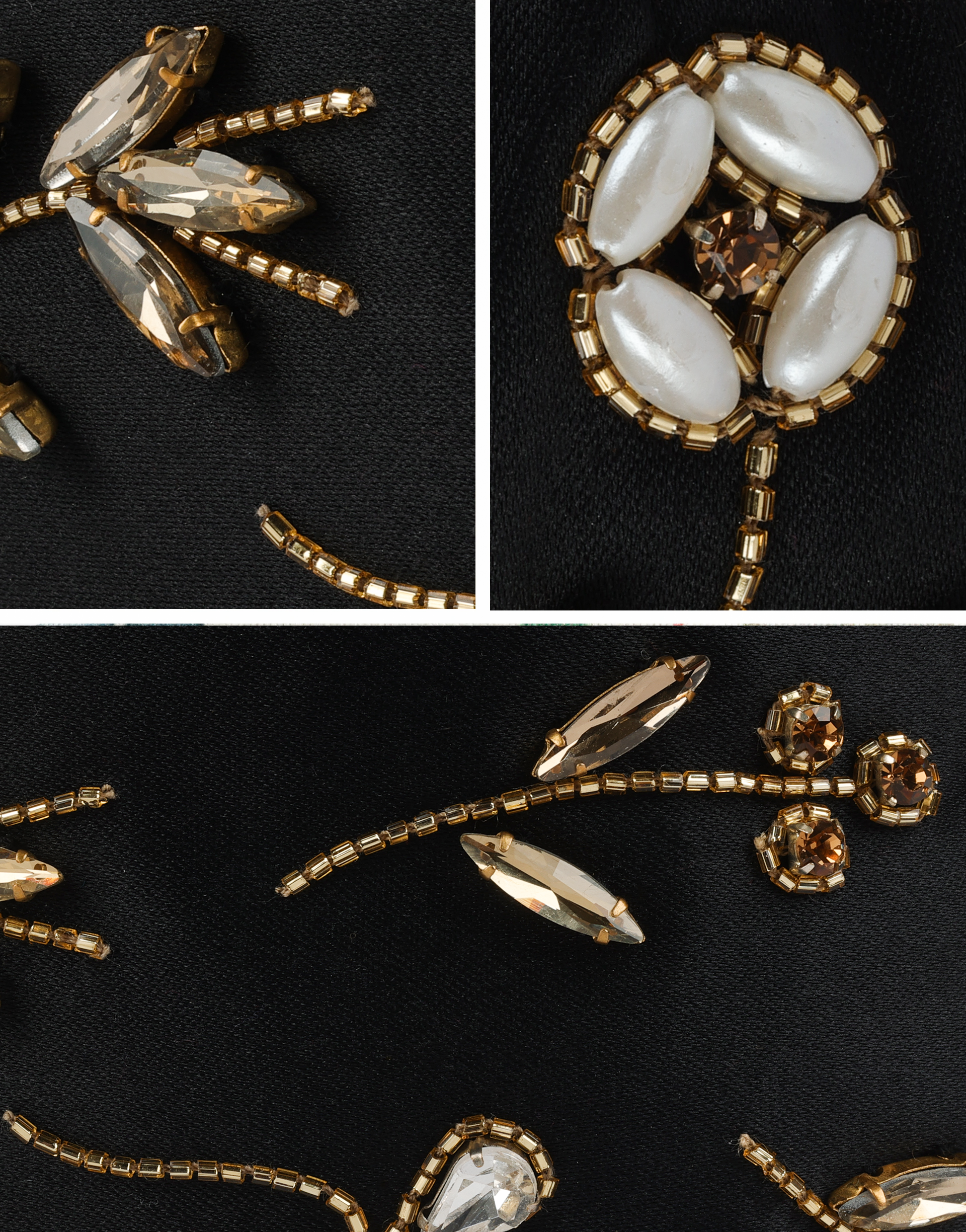 This stunning black headband boasts intricate gold embroidery featuring delicate leaf and bow motifs. The gold accents add a touch of elegance and sophistication to the sleek black base. Perfect for adding a chic touch to any outfit!