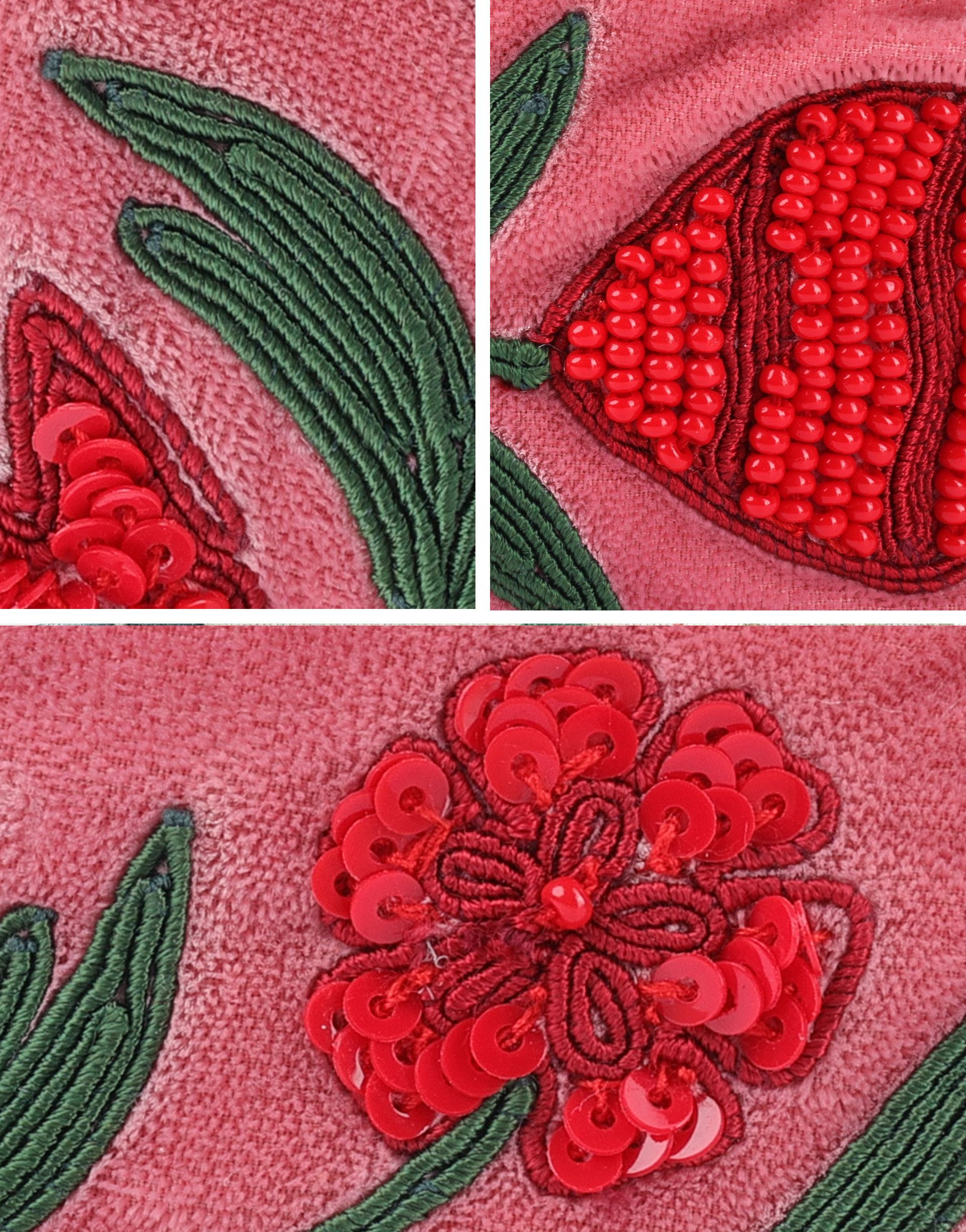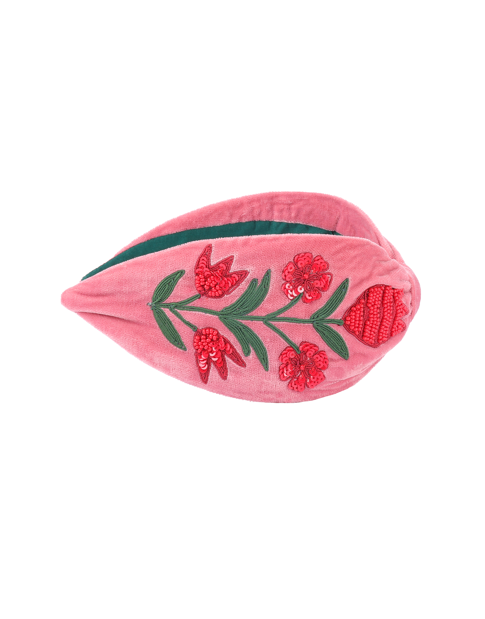 An elegant pink velvet headband embellished with intricate red floral embroidery and sequin detailing. The metallic flowers bloom gracefully, making it the perfect accessory for a sophisticated, evening look .