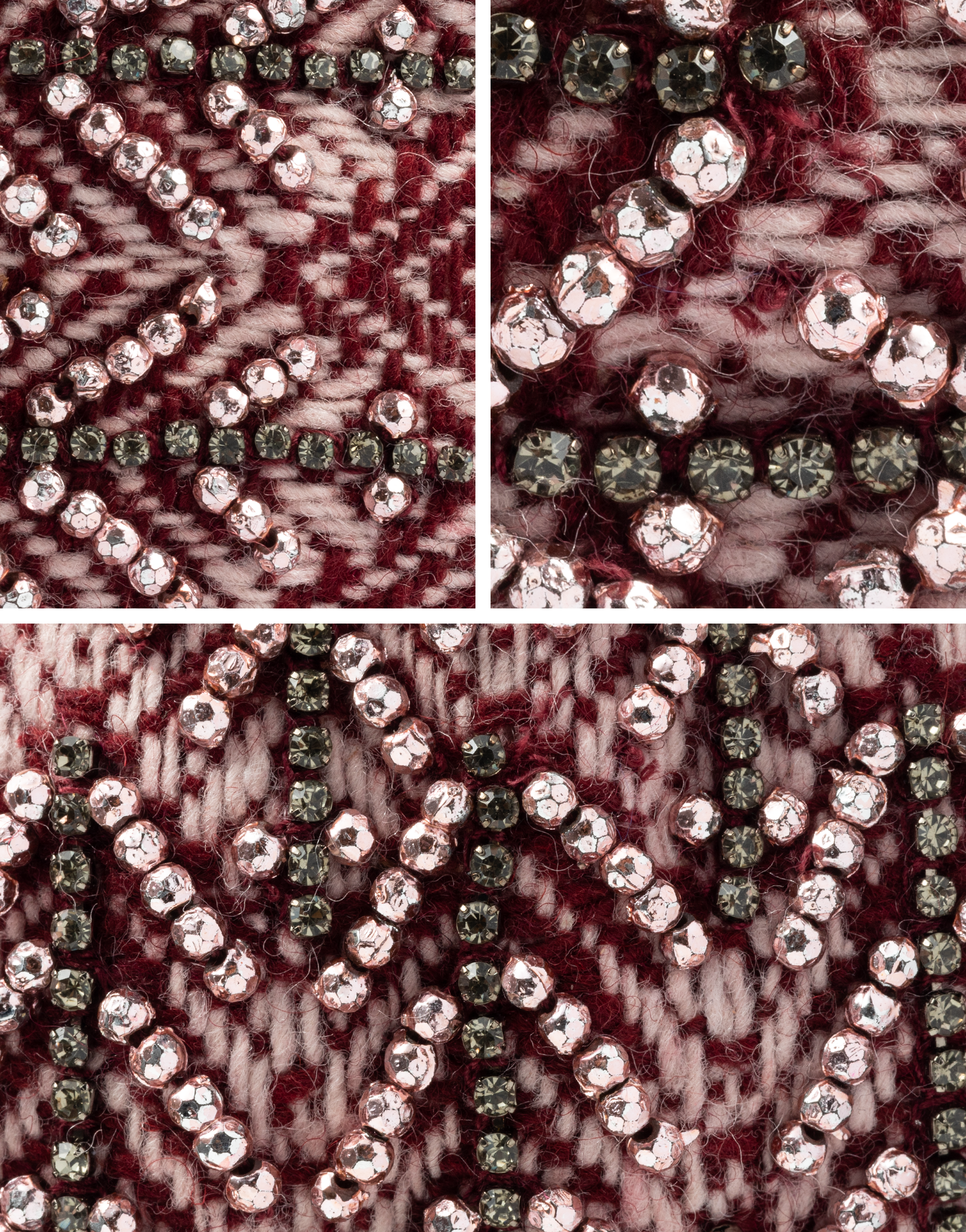 The design is elevated with intricate sequin embellishments, arranged in a delicate branch or leaf pattern.