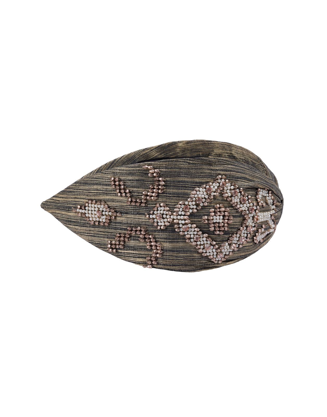 This headband features intricate beadwork on a dark fabric base. The beads form a floral or geometric pattern in shades of gold and white. The design adds a touch of elegance to the overall look.