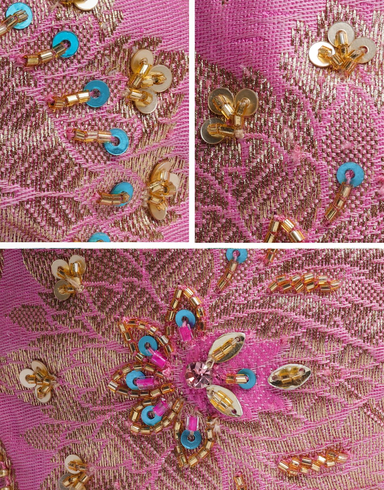 Pink headband with gold embroidery and blue accents. Looks like a royal or fairy-tale accessory. Matches Disney princess vibe.