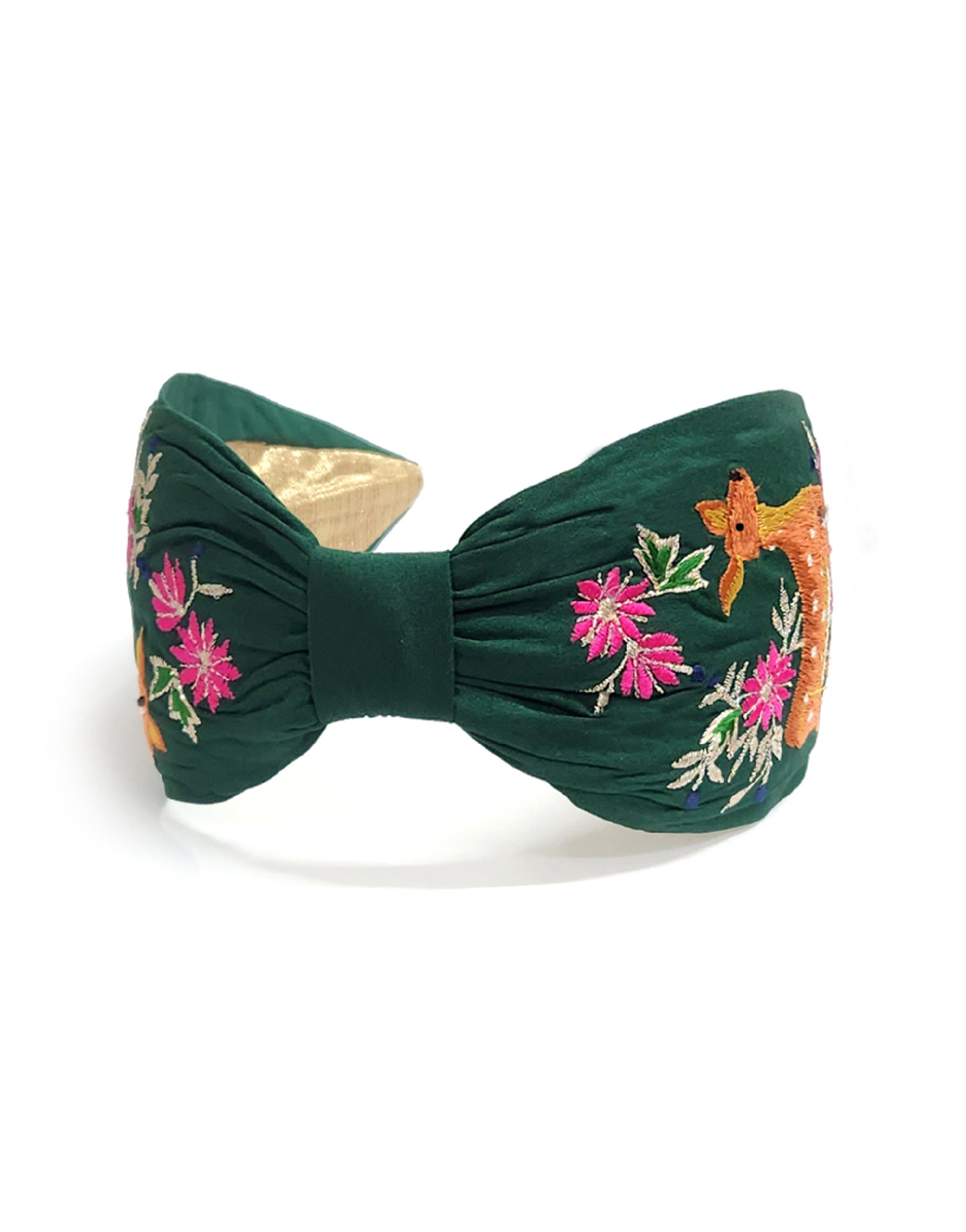 Feel like the queen of the forest with this headband, featuring a sweet embroidered deer and embroidered flowers, all set against the backdrop of a rich green fabric.