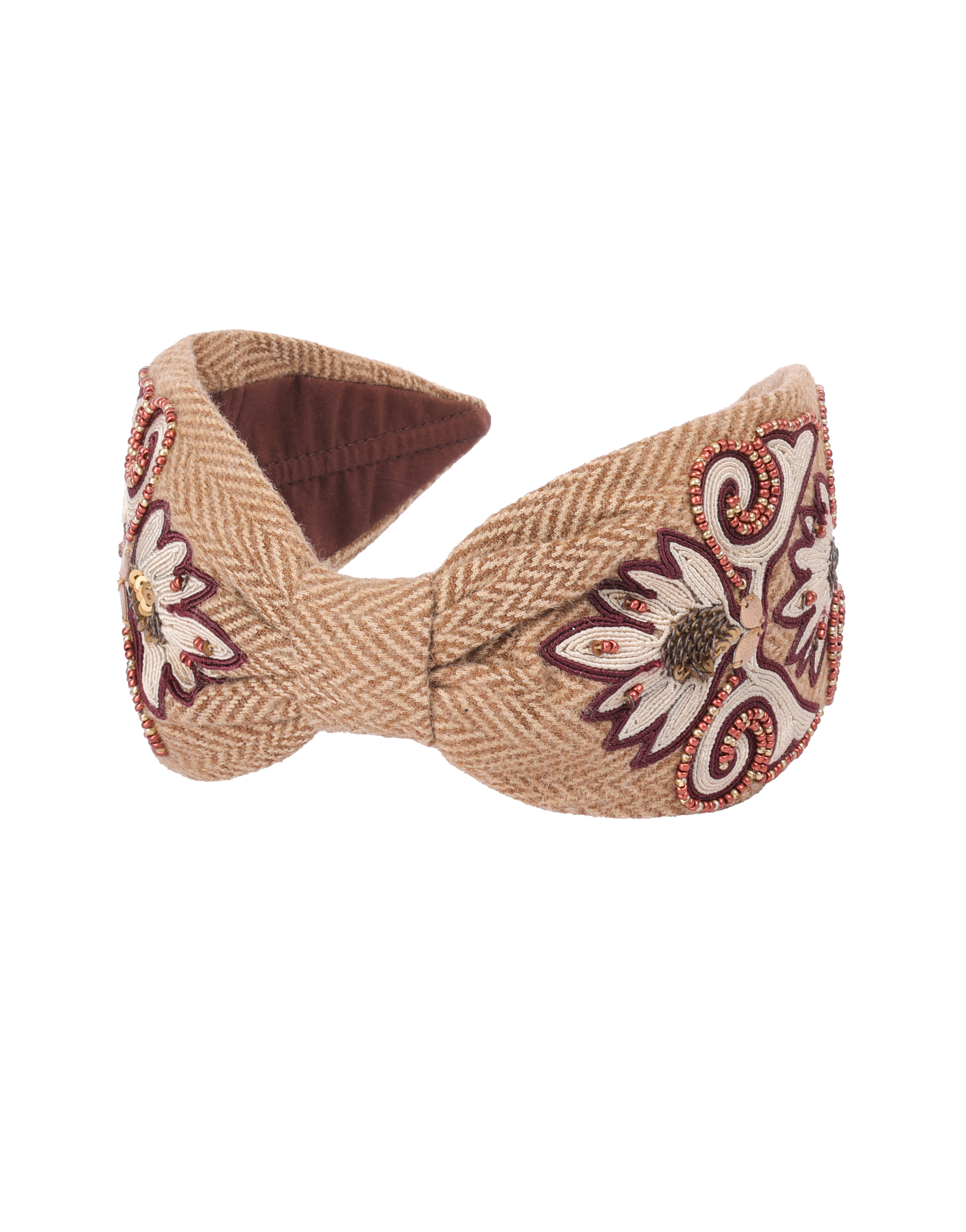 This headband is made of brown tweed fabric with a herringbone pattern. It features intricate embroidery of white flowers with swirling patterns and pink beads along the outlines. The design is accented with a dark brown stripe at the top.