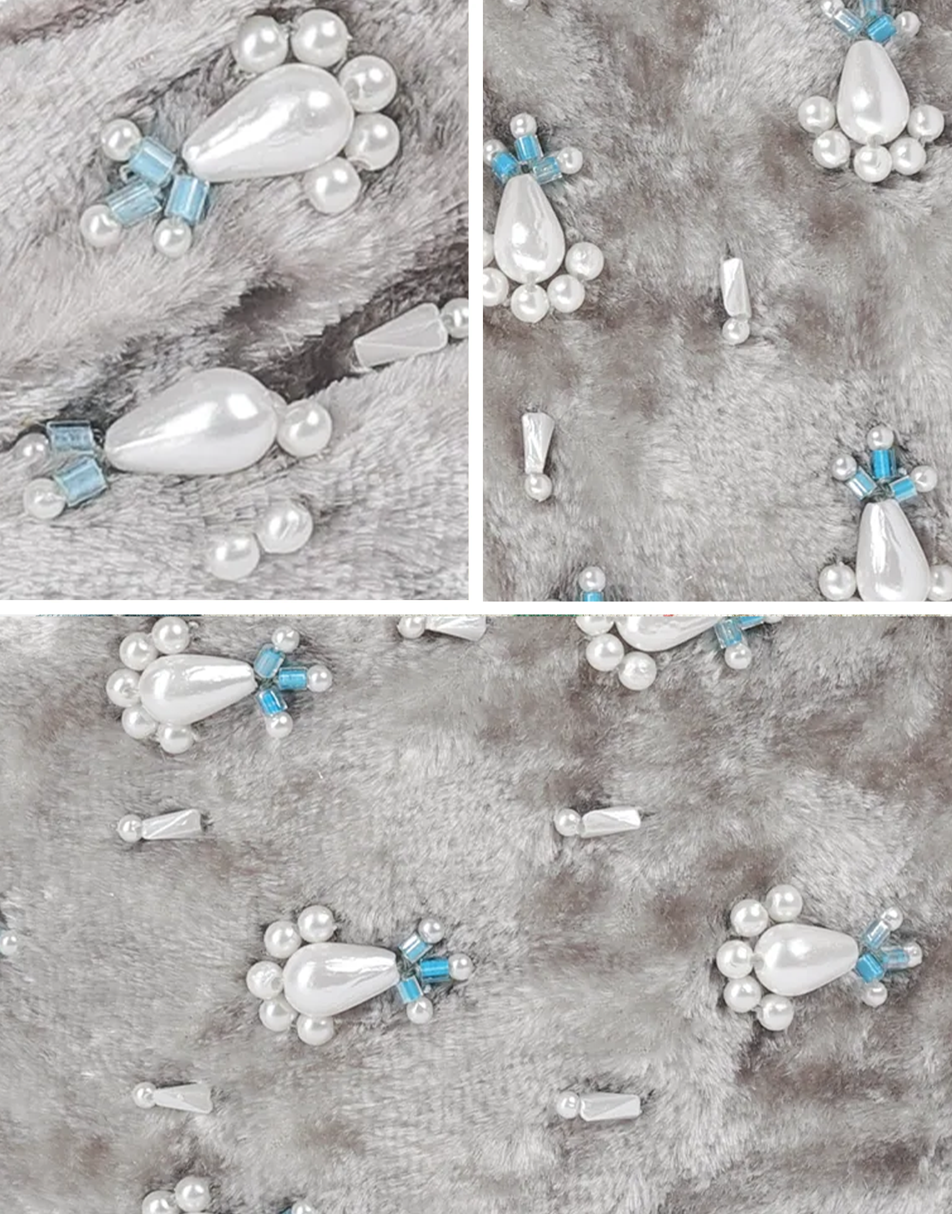 The moon headband has white and blue embellishments on a grey base. The overall look is soft and ethereal. The blue accents add a subtle touch of charm to the design.