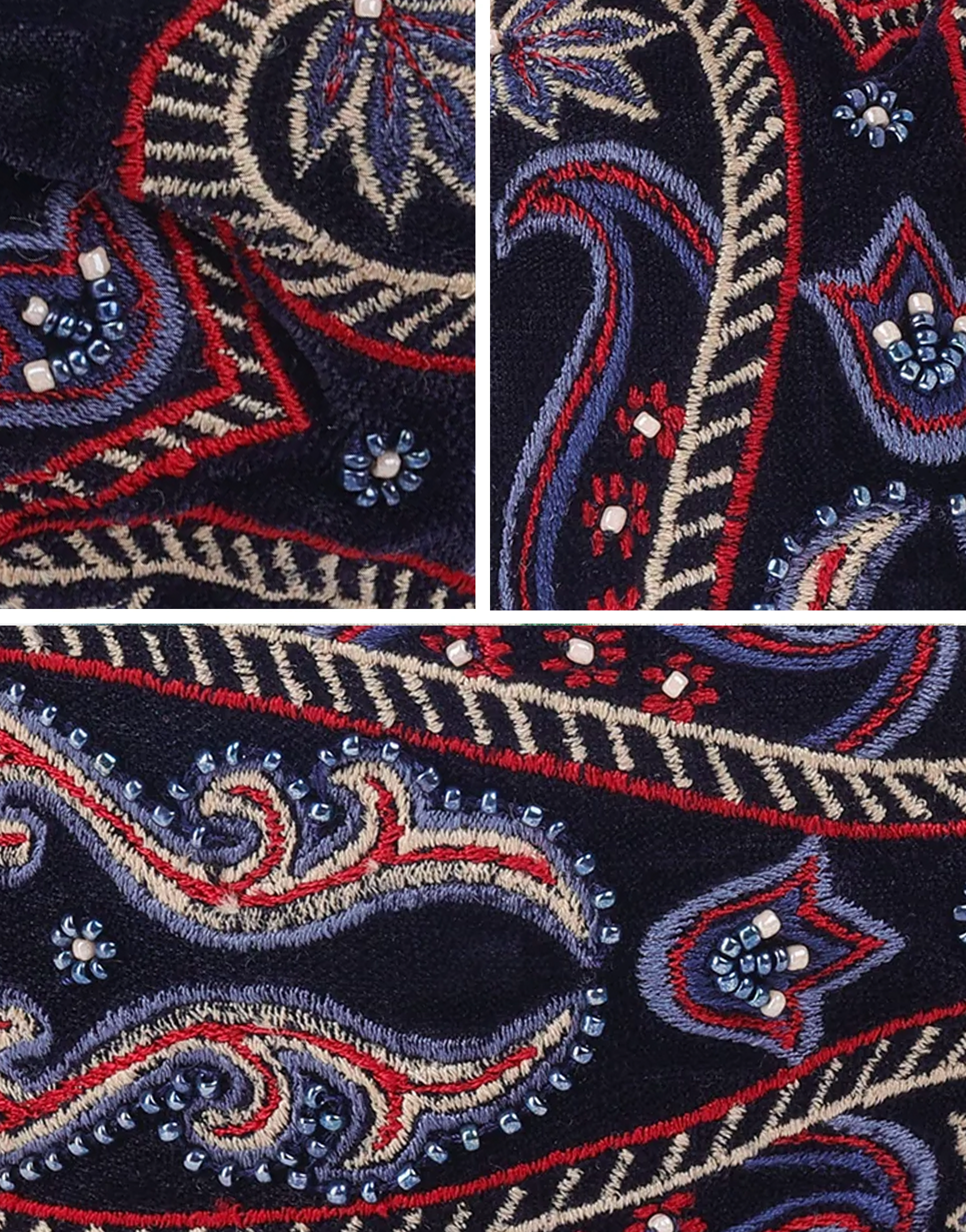 This navy velvet headband features intricate paisley embroidery in red, blue, and cream hues. The design is adorned with floral accents and beads, adding a touch of elegance.