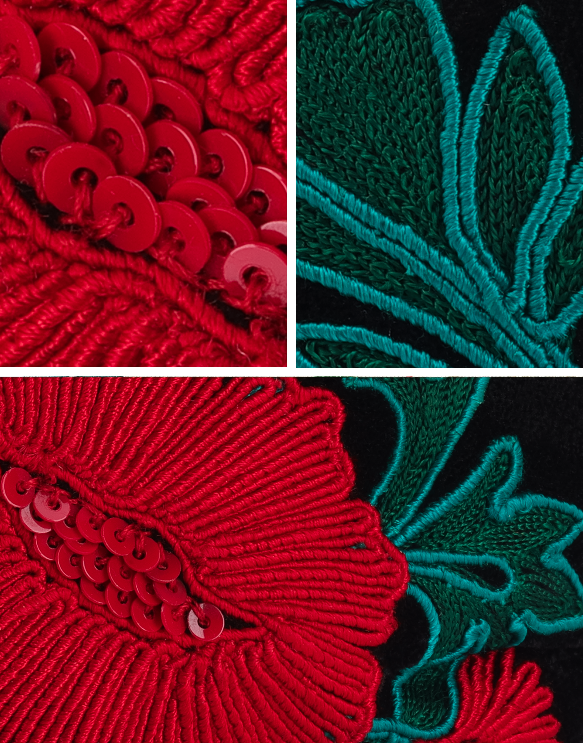 This black-colored headband features intricate red and green thread embroidery on a soft velvet base. Show off your unique and stylish side with this handmade tribal headband, perfect for adding a pop of color and personality to any outfit.